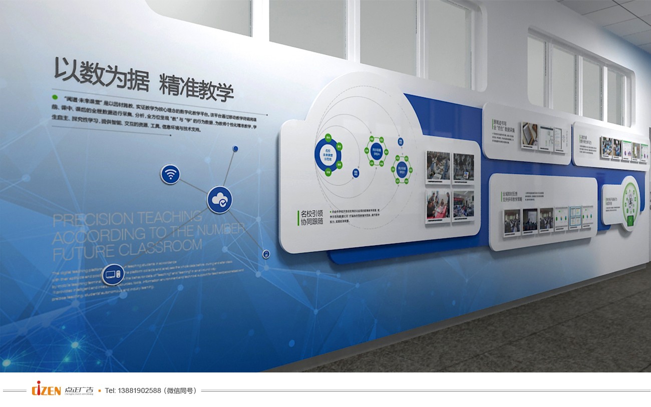 3、利用创新技能规划理念,尽量每一块学校墙体文化墙规划都能结合使用智能技能设备,将静态不变的文字内容转化为各种动态的文字或视频内容。】